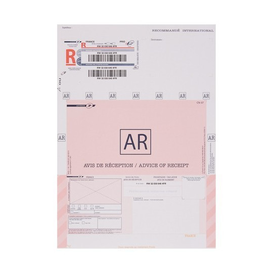 Bordereaux Recommandés A4 Internationaux Avec Accusé et code barre - Réf: 3263